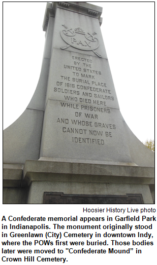 "We are in the midst of the American Civil War Sesquicentennial," he says, "and 150 years ago the war was still raging in its fourth year. Indiana was thick in the fight under the leadership of the war governor, Oliver P. Morton. This titanic conflict in American history is remembered throughout Indianapolis, and the most obvious reminder is the beloved Indiana Soldiers' and Sailors' Monument in the very center of the city." Indianapolis also was the site of a prisoner-of-war internment camp. Camp Morton was opened in April 1861 as a training recruitment camp for Indiana volunteers. It was located in what had formerly been the Indiana State Fairgrounds before the fairgrounds relocated to 38th Street. Camp Morton has an official cast-metal marker at North Alabama and 19th streets near where the camp entrance was. The prison camp's Col. Richard Owen, known to be kindly and humane, was remembered and honored by his former charges by a bronze bust that is near the center of the Indiana Statehouse. The grimmer side of Camp Morton is remembered by the large granite Confederate Memorial in Garfield Park, just inside the southeastern entrance. It originally stood as the funerary monument in Greenlawn Cemetery, where the Confederate soldiers who died in captivity in Indianapolis were originally buried. The monument lists all the names of the Confederate soldiers, as well as their state regiments. A number came from border states that officially remained in the Union. Other reminders include three Abraham Lincoln monuments, the Oliver P. Morton monument at the east entrance of the State House, the Camp Sullivan marker in Military Park and many others. The most recent reminder is the Indy Eleven Football (soccer) Club, named for Gen. Lew Wallace's (Brookville-born) 11th Indiana Regiment. History Mystery